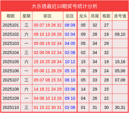 大小分析:近10期前区大小比为24:26,小数出现较为活跃。上期大小比为3:2,本期预测大数出现较为活跃,推荐大小比为4:1。