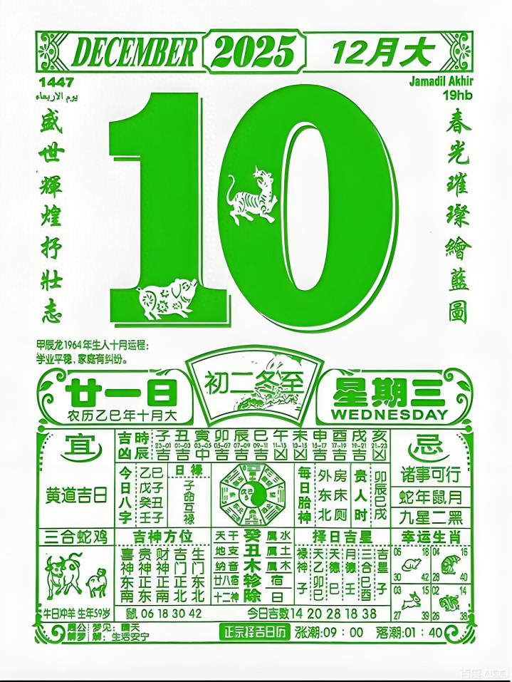 黄历心中过,遇事不出错。12月10日,星期三,农历十月二十一,大家可以先留下一句:喜从天降。祝福一下自己。这天值神是天德,象征顺遂与助力,适合结婚、开业等大吉活动,可化解灾厄,增益福报,大家记得祈福纳财,迎接好运。这天是除日,象征除旧不新,同时属于黄道吉日,适宜解除旧物,如理发、整理、打扫等。穿衣颜色推荐白色、银色、米色系。不推荐黑色、蓝色、灰色。打麻将求职找工作的可以去南边,约会谈恋爱的可以约在家东南边。生肖注意事项,小鼠精力充沛,小牛动力十足,小虎头脑活跃,小兔平平安安,小龙做事急躁,小蛇神采飞扬,小马玩乐心重,小羊阻碍多多,小猴好运连连,小鸡吉星簇拥,小狗意外之事,小猪为财所烦,有缘刷到,祝你开心,福生无量。