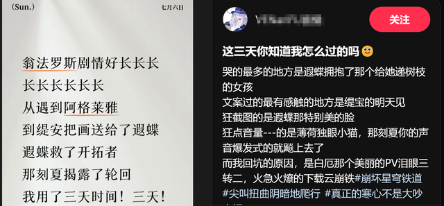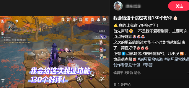 比如有位国人玩家也发文表示,他本来也不是剧情党,每次都是疯狂点点点。在看到星穹铁道宣布加入跳过功能后,为了白厄提前回坑补主线任务,但随着剧情的深入,她也逐渐被剧情吸引。结果等到跳过功能实装后,她反而不想跳过剧情了。