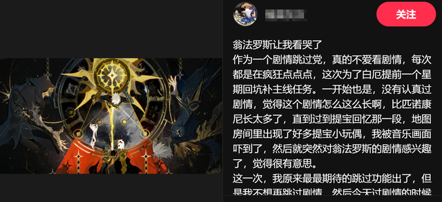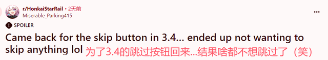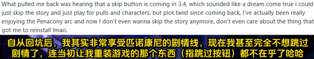这位玩家早在仙舟罗浮版本弃坑,而在听闻3.4版本加入跳过按钮后,他为了体验抽卡和崩铁优秀的角色塑造选择回坑。回坑后的他发现崩铁从匹诺康尼版本开始,剧情愈发精彩,以至于他都忘记去按跳过按钮,完全沉浸在主线内容之中了。