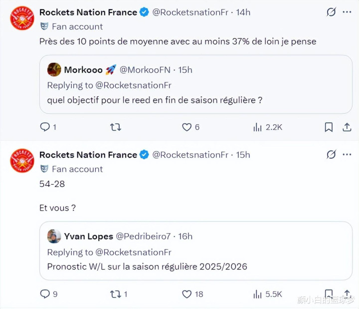 北京时间8月14日,火箭媒体Rockets Nation France在与火蜜聊天时认为火箭队新赛季会拿到54胜28负的战绩,就算在强队林立的西部,火箭队战绩也会是西部前三的存在。