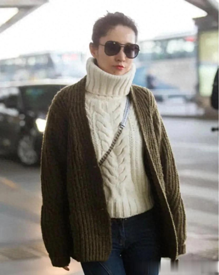 > 刘敏涛不愧是穿搭高手! 高领毛衣叠穿针织开衫, 配喇叭裤好时髦!