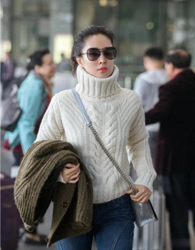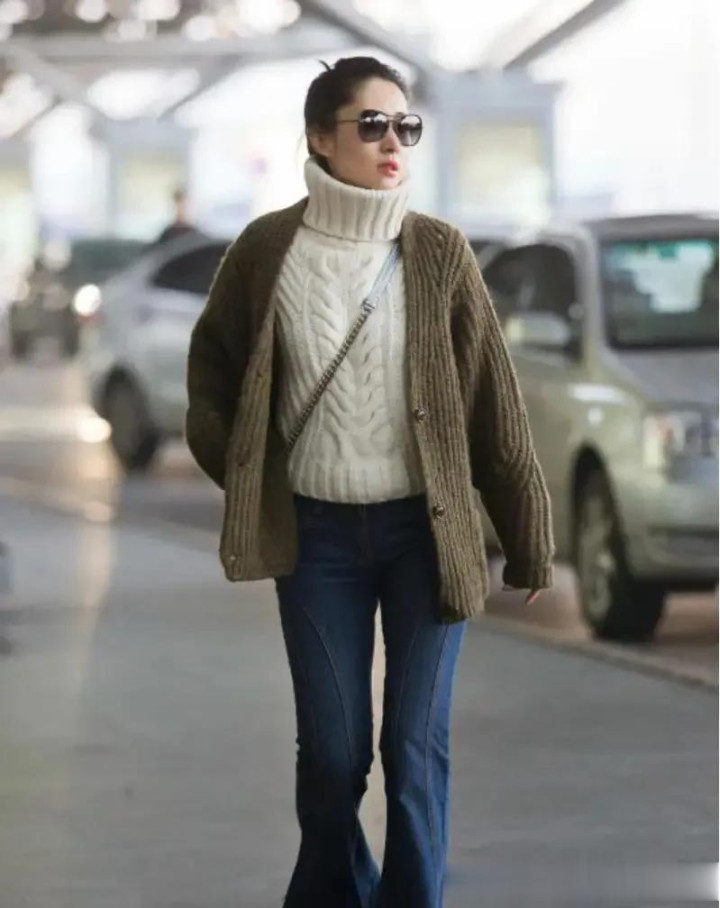 刘敏涛不愧是穿搭高手! 高领毛衣叠穿针织开衫, 配喇叭裤好时髦!